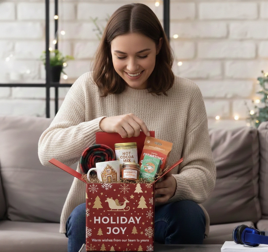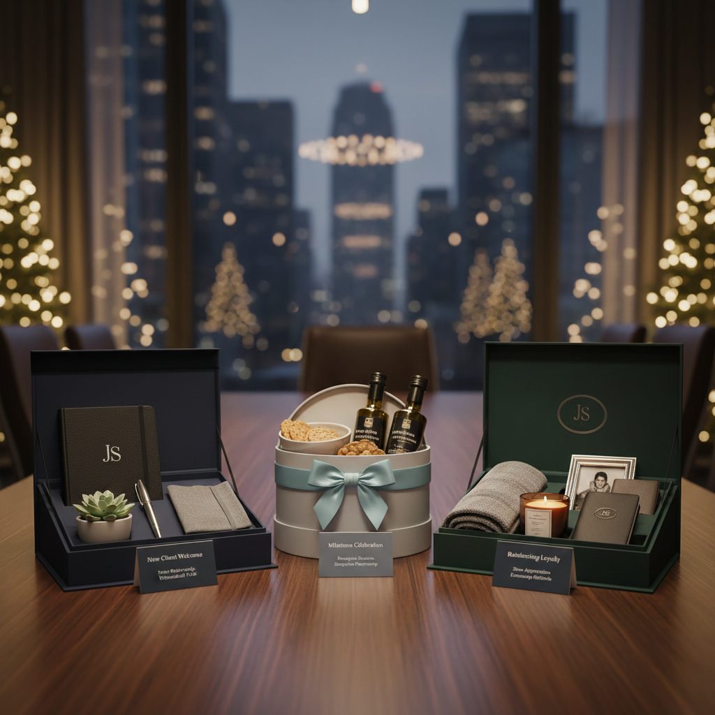 Curated holiday gift boxes for 300+ clients featuring premium drinkware and gourmet treats.